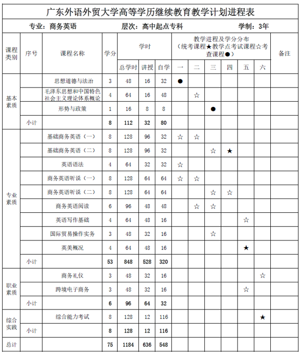 总学分75,其中基本素质课程8学分;专业素质课程53学分;职业素质课程6学分;综合实践课程8学分。