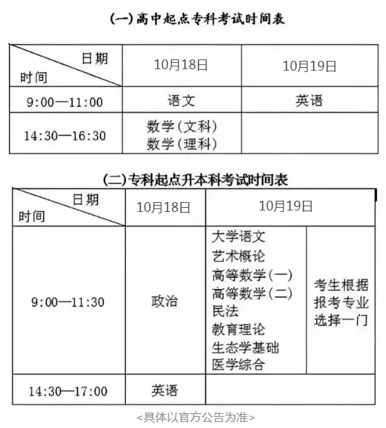 专升本(专科起点升本科) :考试科目均为三门,其中两门公共课为政治、英语,一门专业基础课根据招生专业所隶属的学科门类确定。专业课包括大学语文、艺术概论、高数(二)、民法、教育理论、医学综合、生态学基础等,考生根据所报专业选择其中一门进行考试
