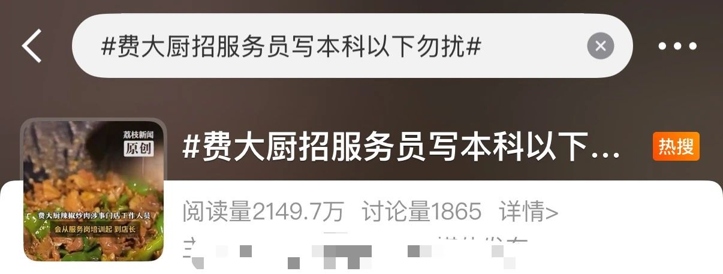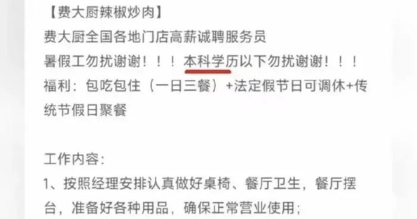 近日,深圳有网友发帖称,费大厨辣椒炒肉一门店招聘服务员,月薪五千到六千元,要求“本科学历以下勿扰”,受到网友广泛关注。