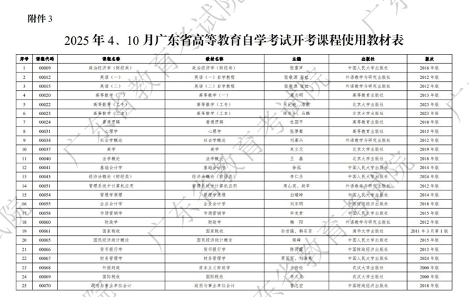 根据《2025年广东自考开考课程考试时间安排和使用教材》知悉,2025年10月份广东自考开考课程使用教材发布,详情如下: