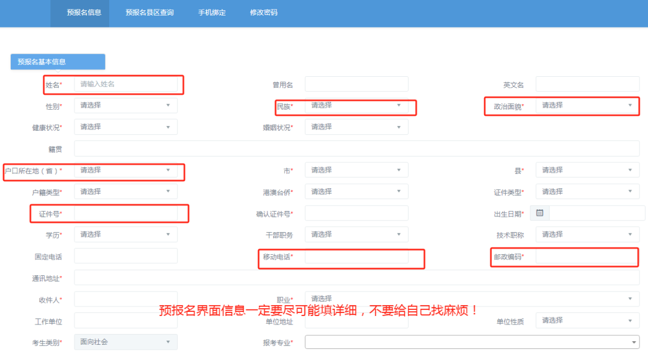 填写信息:选择【考生入口】-【考生预报名】,登录后填写个人基本信息,包括姓名、身份证号、联系方式等,最终获取预报名号及准考证号。