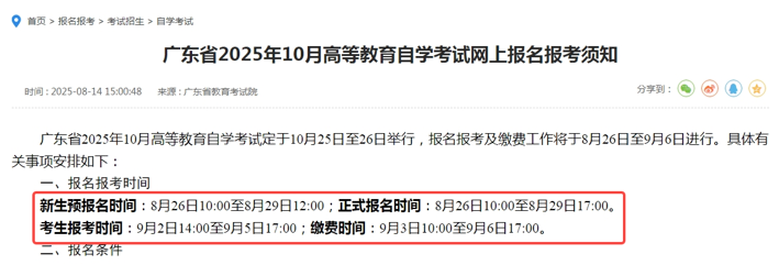 2025 年 10 月广东自学考试将于本月 26 日开始报名,报考公告已经公布了,如下整理的报考详细信息: