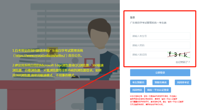 登录广东省自学考试管理系统,点击【考生入口】,网址:https://www.eeagd.edu.cn/selfec/。