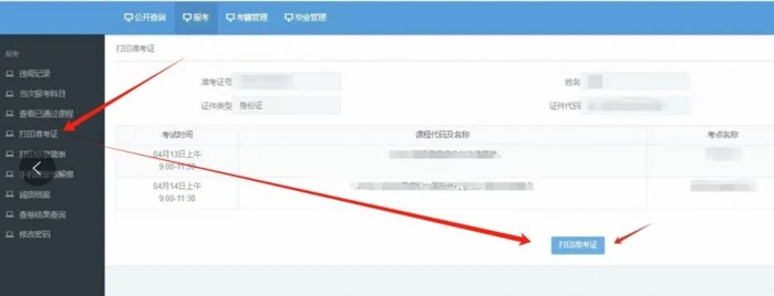 在左边菜单栏点击打印准考证,跟随下图箭头点击打印准考证,即可下载打印