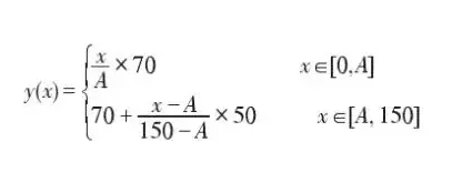 卷面分数≥及格分数时:Y(X)=70+(X-A)/(150-A)*50