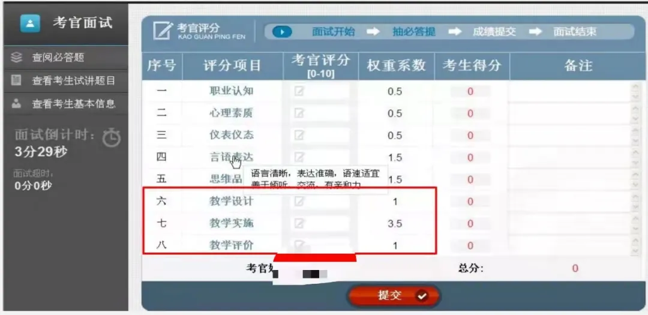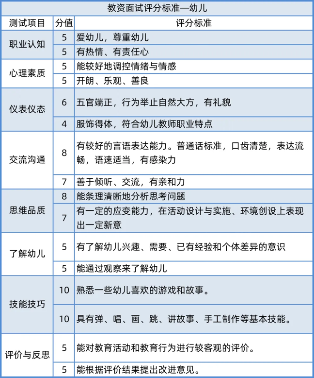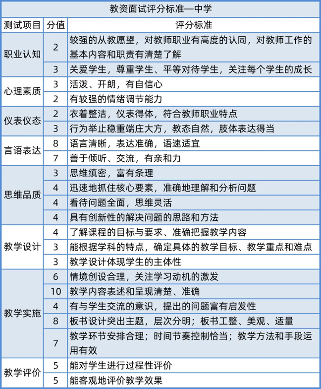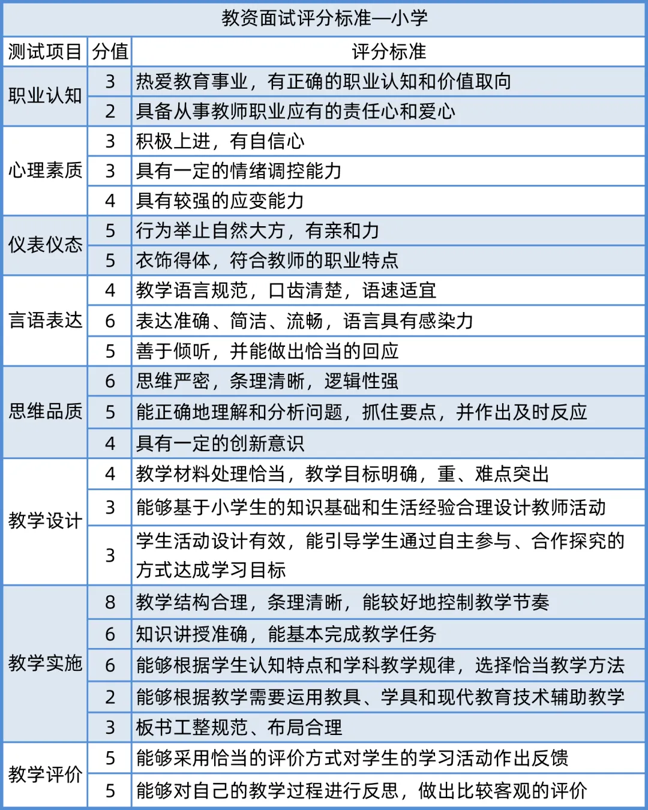 虽然教资面试没有严格的卷面,但却有一定的评分标准! 面试考试中,考生的仪容仪表、语言表达、教学设计、教学实施、教学评价、学科知识、逻辑思维等都是考官打分项。