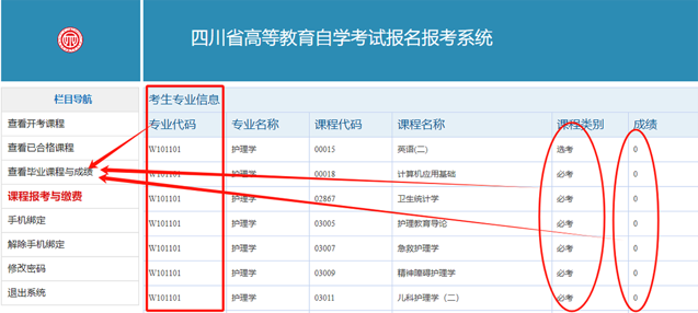 查看毕业课程与成绩。点击左边菜单栏“查看毕业课程与成绩”,可以查看本专业下的课程及已获得的成绩。