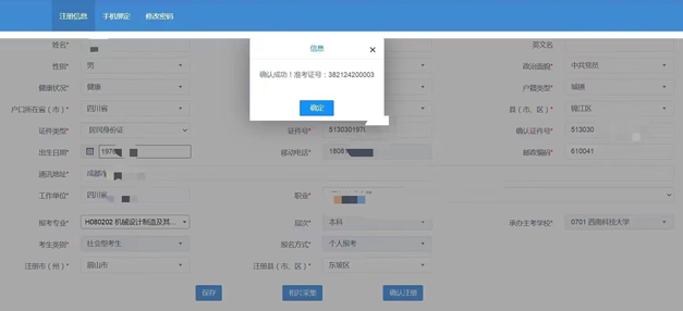 相片采集核验通过后,点击“确认注册”按钮,系统将生成考生的准考证号,注册流程完成。特别提醒