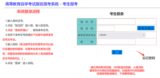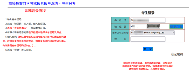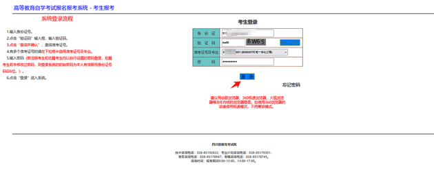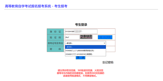 选择要报考的准考证后,输入密码,点击“登录”进入系统。新注册考生和在籍考生均以自行设置的密码登录,在籍考生若未修改过密码,则登录系统的初始密码为本人有效居民身份证号码后6位。