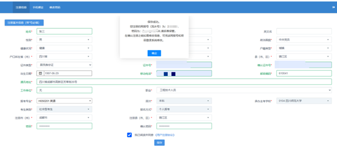 (二)勾选“我已阅读并同意用户协议”,然后点击“保存”按钮以保存考生基本信息。