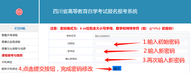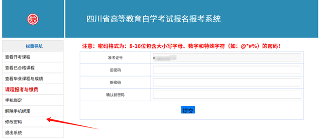 考生在绑定完手机后,需要修改密码。系统会在绑定完手机后,自动跳转到修改密码界面。先输入初始密码(新注册考生和在籍考生均以自行设置的密码登录,在籍考生若未修改过密码,则登录系统的初始密码为本人有效居民身份证号码后6位),再输入新密码并确认一次,“提交”后生效,重新登录即可。