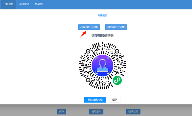 (一)在注册基本信息页面,点击页面下方的“相片采集”按钮,进入相片采集流程。可以选择两种方式进行相片采集,第一种方式通过小程序进行相片采集,第二种方式通过网页端进行相片采集。