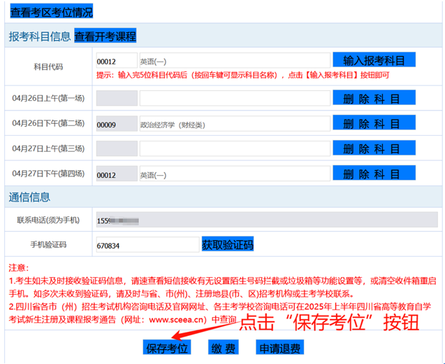输入收到的短信验证码,点击“保存考位”。特别提醒