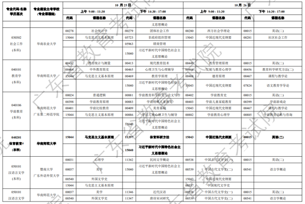 2025年10月广东省自学考试各专业开考课程考试时间安排表: