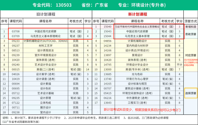 这里以自考本科环境设计专业为例:环境设计本科新的考试计划中大部分实践考核课程变为笔试科目,但是根据粤考委〔2023〕5号文件的新旧专业考试计划课程顶替规则,学生如果在旧考试计划中通过所有的实践考核科目,也可以在新计划中进行课程顶替,从而笔试只需要考3门课程:习概、马克思和近代史。