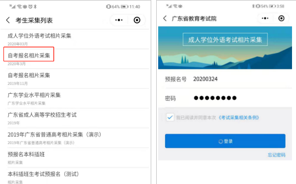 (2)在考试列表中找到自考报名相片采集,输入预报名号与预报名时设置的密码登录。