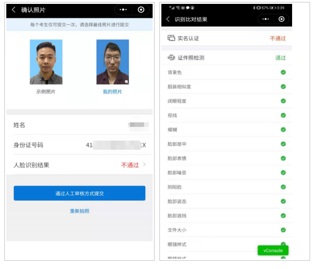 识别不通过时可以点击人脸识别结果查看不通过原因并重新尝试,当多次尝试不过后可以选择通过人工审核方式提交(需补充身份证正反面、手持身份证相片),等待人工审核(审核仍不通过的,及时与当地自学考试办公室联系咨询)。