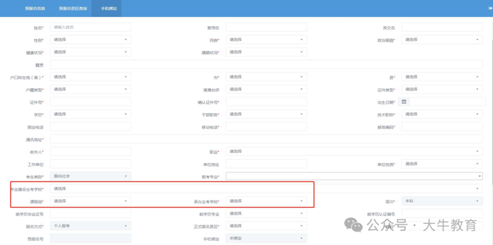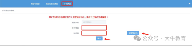 确认预报名号码无误后,填写手机号码,点击获取验证码并填写,最后点击绑定