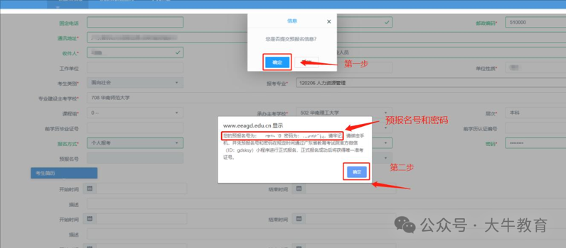(5)信息填写完点击确定后 ,产生预报名号*记住预报名号和密码
