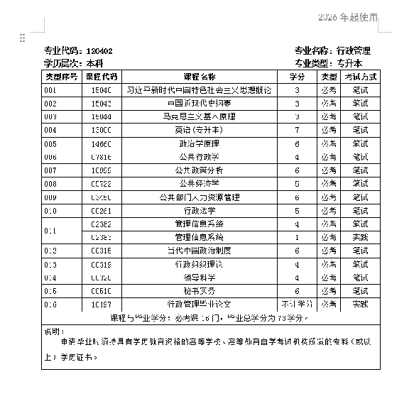 行政管理本科层次考试科目(专升本,专业代码 120402):