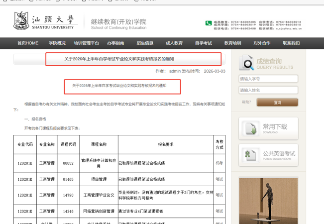 【汕大】关于2026年上半年自学考试毕业论文和实践考核报名的通知
