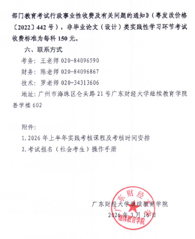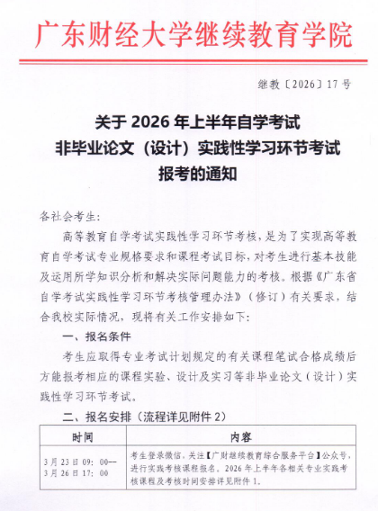 广东财经大学2026上半年自考非毕业论文实践性学习环节考试报考的通知