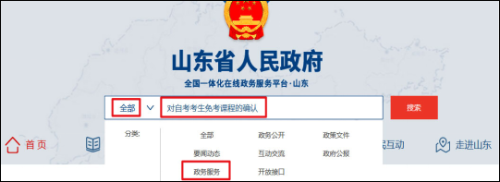 (二)在网站首页的搜索框左侧点击“全部”,从“分类”中选择“政务服务”,在文本框中输入“对自考考生免考课程的确认”,点击“搜索”后,从搜索结果中找到如下页面。