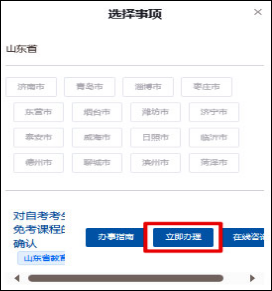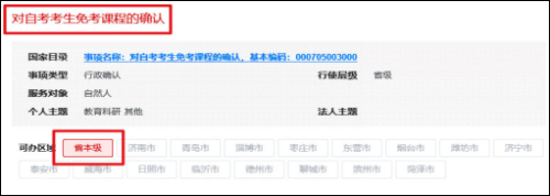 (三)点击红色标题“对自考考生免考课程的确认”,在弹出的“选择事项”页面中,点击红色框内的“立即办理”。