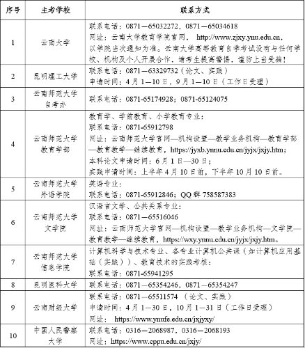七、云南省高等教育自学考试各专业实践性环节考核、论文答辩联系方式: