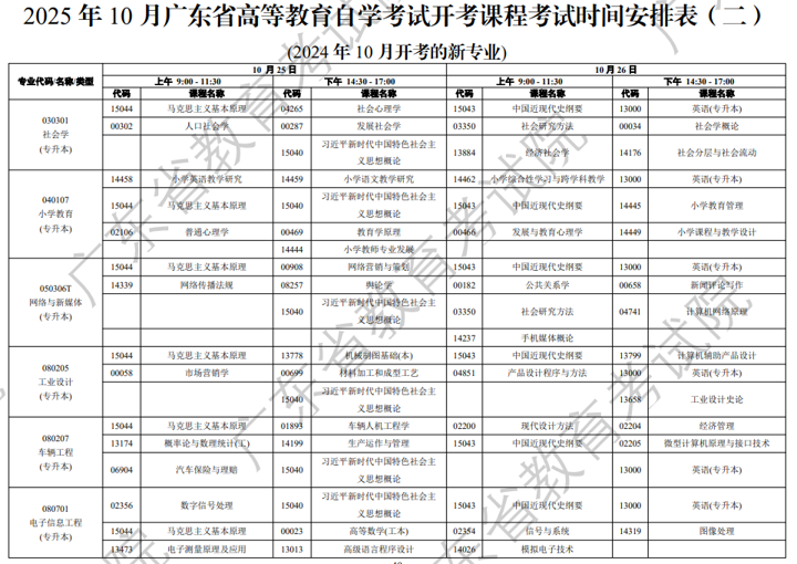 广东省2025年1月、4月、10月各专业开考课程具体时间安排已经公布!下半年就只剩10月份自考了,大家提前安排好考试科目,可以提前备考。 2025年10月广东省自学考试各专业开考课程考试时间安排表 :