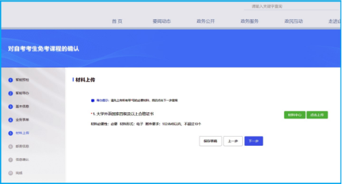 6.点击“下一步”按钮,进入材料上传页面(如下图),请点击绿色的“点击上传”按钮,按照要求上传对应的材料图片,图片格式为JPG。