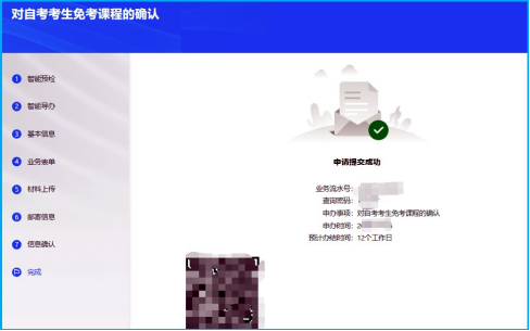 7.完成材料上传后,点击“下一步”按钮进入信息确认页面,考生检查确认后提交最终的免考申请,出现“申请提交成功”页面后(如下图),办理完成。