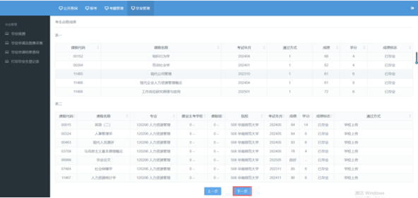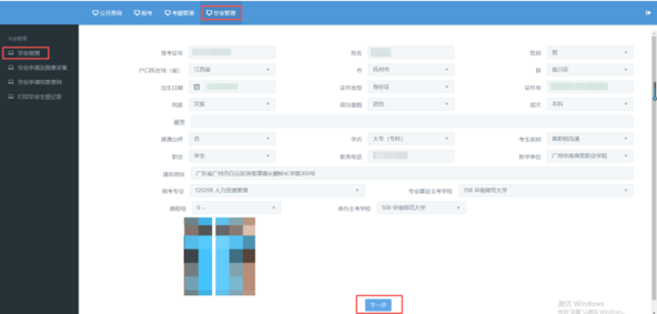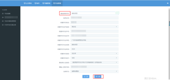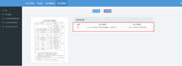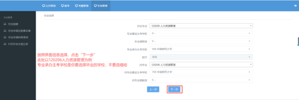 点击“毕业管理”,点击“毕业预测”,点击“下一步”