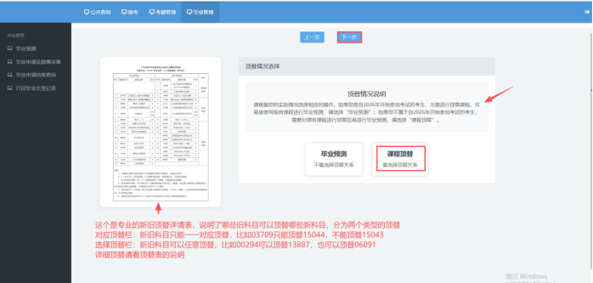 旧生(2026年之前开始考试的自考生)点击“课程顶替”,再点击下一步