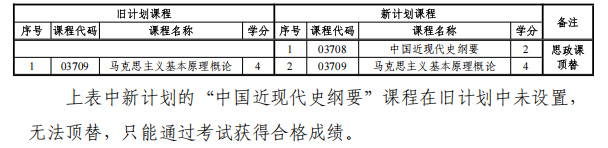 各专业新计划均设置了2门思想政治理论课(简称“思政课”),本科层次设置中国近代史纲要(课程代码:03708),马克思主义基本原理概论(课程代码:03709);专科层次设置思想道德修养与法律基础(课程代码:03706)、毛泽东思想和中国特色社会主义理论体系概论(课程代码:12656)。使用新计划毕业时,旧计划的思政课可在新计划中直接使用。如果旧计划思政课不足两门,则需要按照新计划要求报考。举例: