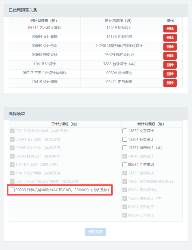 (1)课程顶替只能在同一专业中使用,不同专业的课程顶替规定不同,不能跨专业使用。