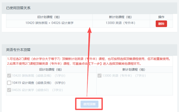 如果还没考英语的考生,需要用两门科目来顶替英语成绩。假设该同学选择装饰表现和设计美学,顶替英语(专升本)成绩。则该同学还剩下1门设计调查可以用来顶替其他科目。