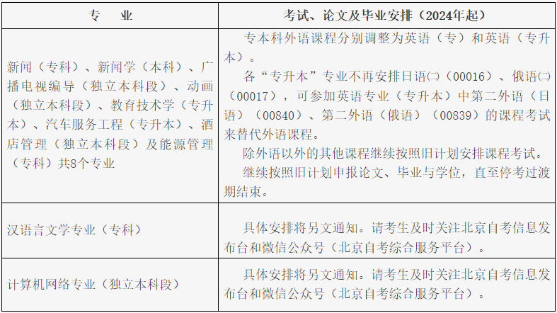 各停考专业的停考过渡期时间保持不变,均按之前发布的通知执行。2024年起至停考过渡期结束,各停考专业的考试、论文及毕业等安排如下: