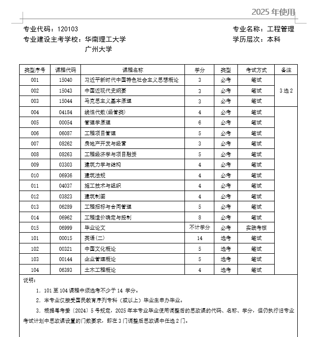 2026年广东自考工程管理专业新政策考试科目表