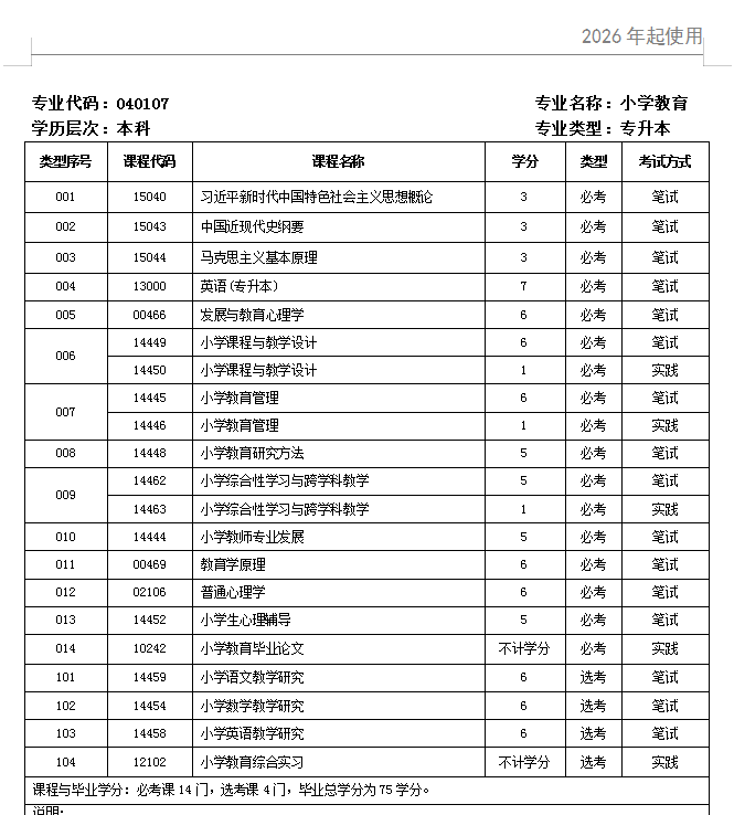 2026年广东自考小学教育本科考试科目最新公布!附各科目学分详情!